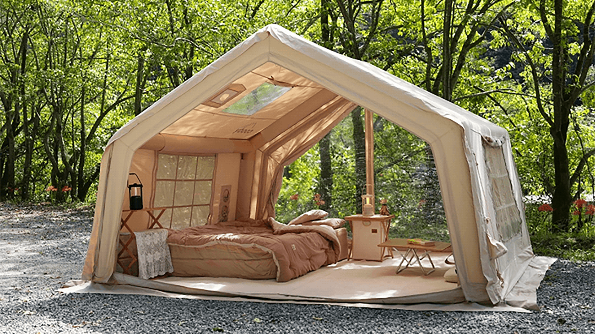 - Szybki w rozłożeniu: Namiot wykorzystuje nadmuchiwany stelaż, który można napompować pompką , co pozwala na jego rozstawienie w kilka minut. Stelaż jest lekki, ale niezwykle wytrzymały dzięki rozproszonym komorom powietrznym, które podtrzymują całą konstrukcję.