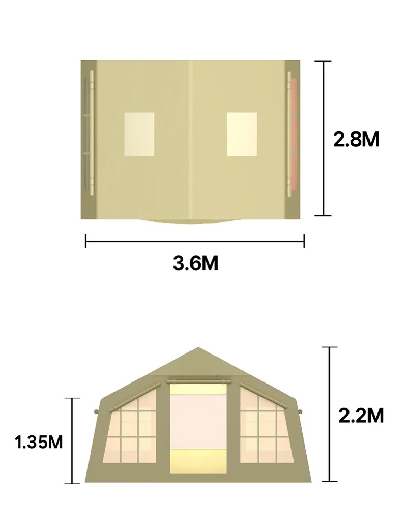 - Otwartość: 4 boki namiotu można całkowicie otworzyć w celu wentylacji lub połączenia z innymi modułami.